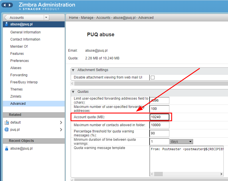 - Next, select the "Advanced" account settings and modify the account limit. (Setting it to 0 means unlimited)